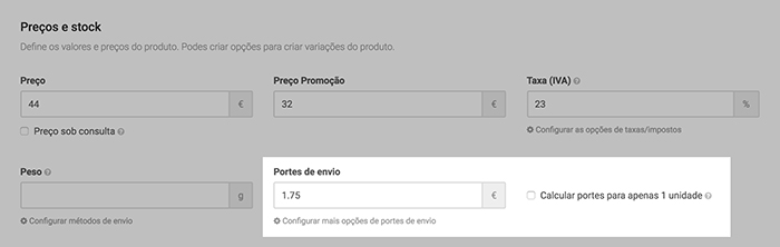 Deve ainda definir se o valor dos portes de envio é calculado só para a primeira unidade ou multiplicado pelo número total de unidades que o cliente compra.