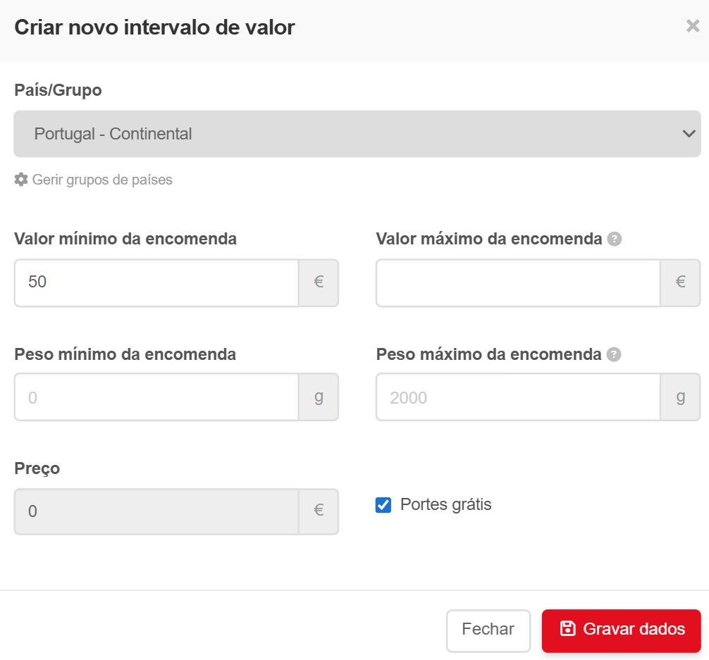 - Se pretender configurar os portes gratuitos com base no valor total da encomenda insira o intervalo de valor e selecione a opção Portes grátis (ex. Portes grátis para Portugal Continental em encomendas a partir de 50€);