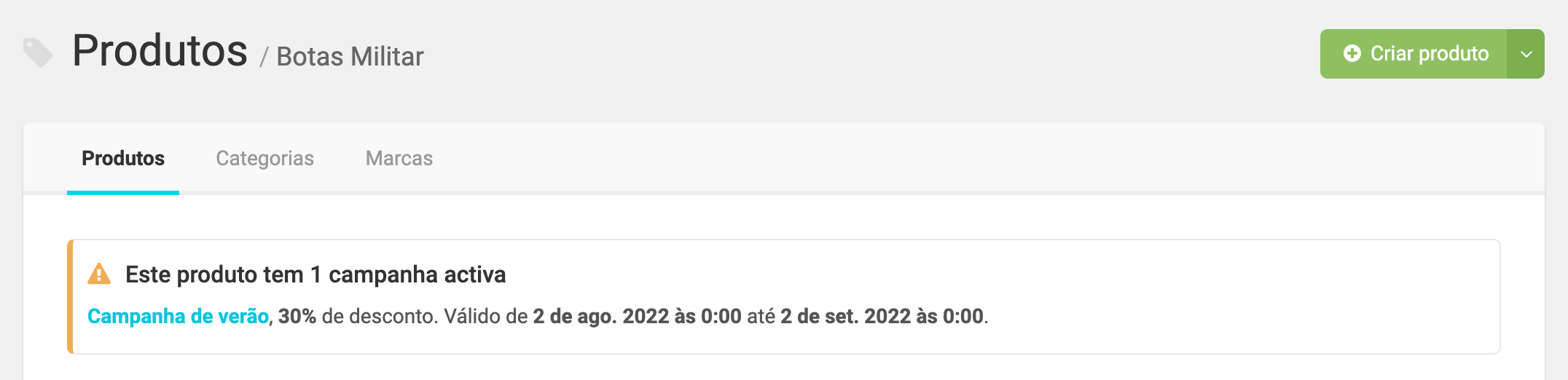 - Caixa de aviso: Cria um destaque visual num bloco dedicado do detalhe do produto, com o nome da campanha, valor do desconto e data de validade. Este destaque surge visível abaixo do preço do produto.