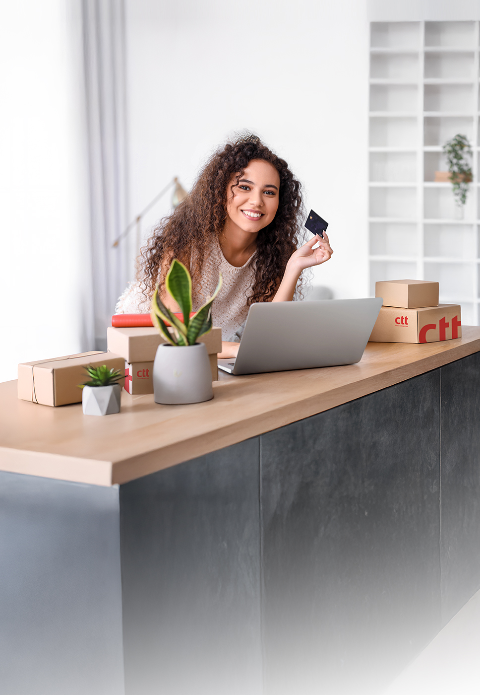 Laptop aberto com pequenas caixas de cartão que têm o logótipo dos CTT