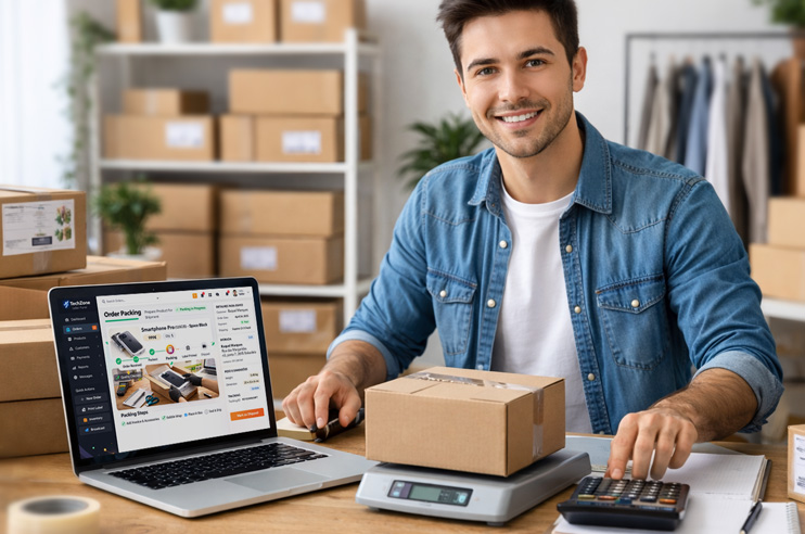 Mulher sentada à secretária a embalar uma encomenda numa caixa de cartão.