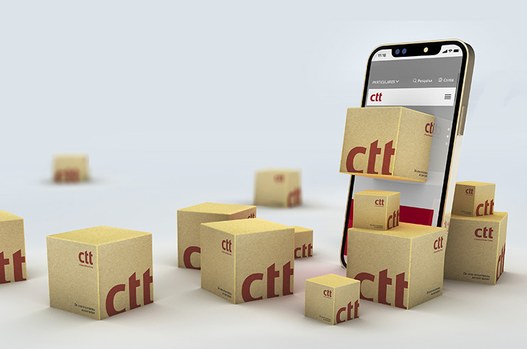Ilustração da página inicial da App CTT aberta no smartphone e de um envelope ao lado